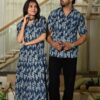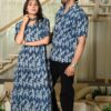 A charming blue cotton outfit adorned with elegant white leafy block prints. The women?s tiered V-neck dress pairs beautifully with the men?s casual half-sleeve shirt, creating a stylish couple look perfect for brunches, vacations, and casual gatherings.