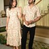 This Cream floral matching outfit set includes a women?s midi dress and a men?s short-sleeve shirt, both featuring vibrant red ethnic prints. Perfect for couples who love twinning in style at casual outings, festive gatherings, or vacations.
