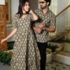 Couple Matching Beige Cotton Anarkali Midi Dress and Shirt Set ? Swirl Block Print