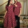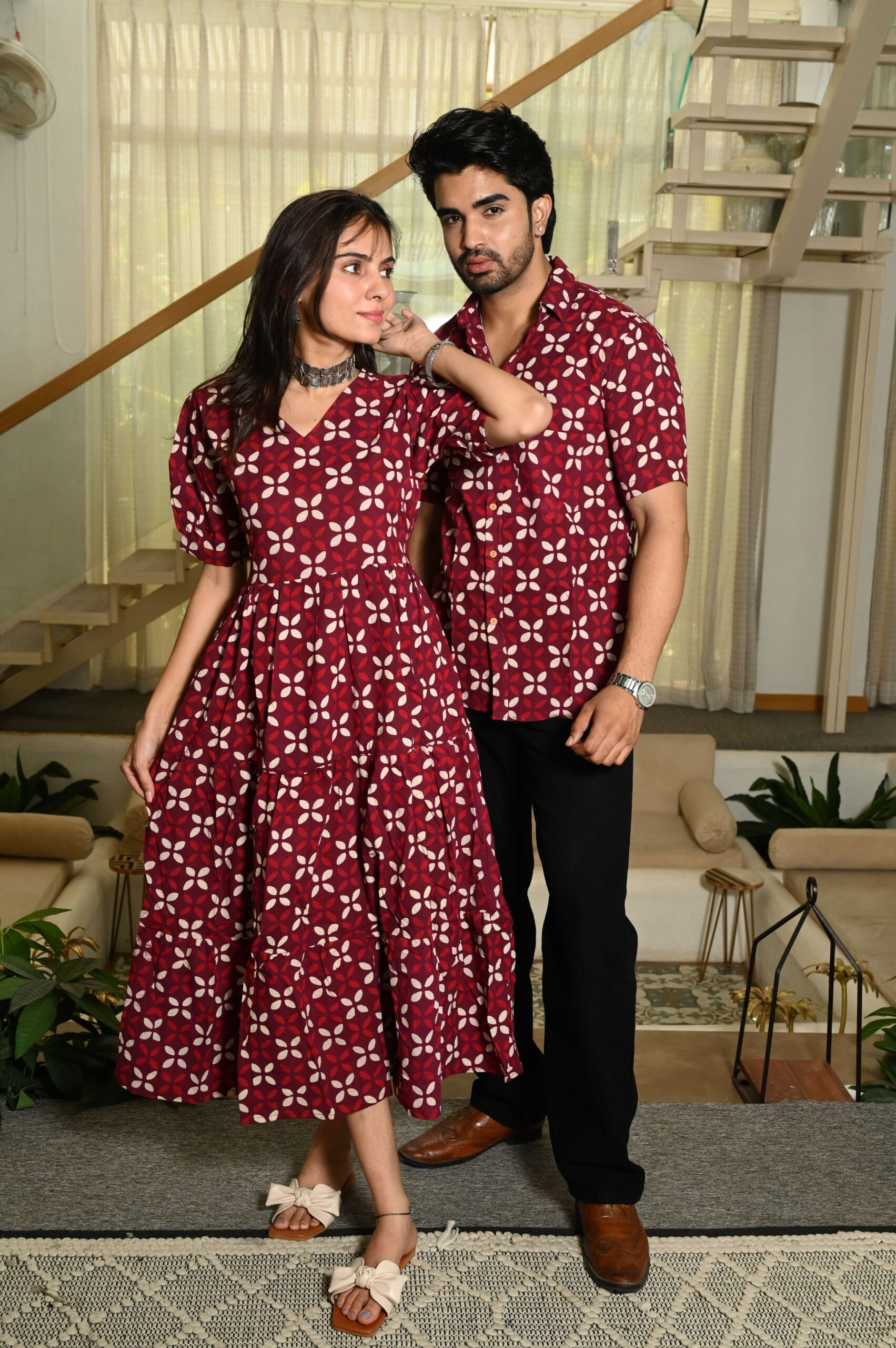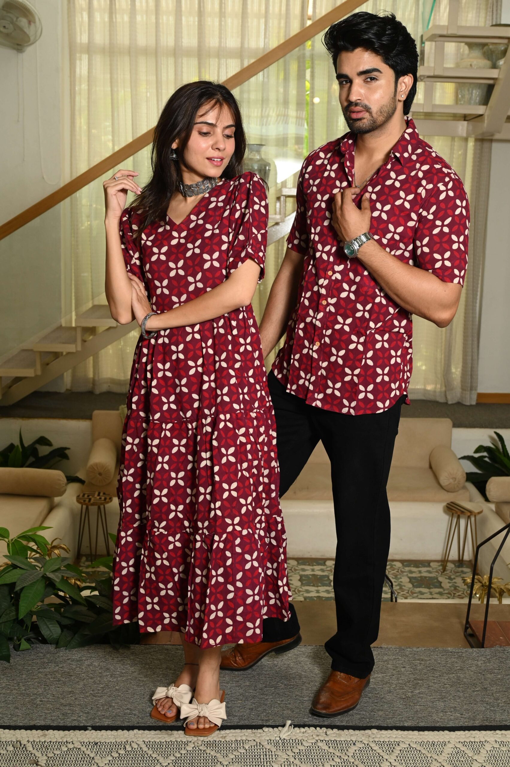 Couple Matching Maroon Cotton Printed Anarkali Midi Dress & Shirt Set ? Casual & Festive Wear