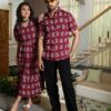 This Maroon matching outfit set includes a women?s midi dress and a men?s short-sleeve shirt, both featuring vibrant red ethnic prints. Perfect for couples who love twinning in style at casual outings, festive gatherings, or vacations.