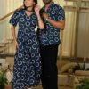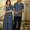 A modern navy blue cotton outfit highlighted with bold white circular prints. The women?s flowy V-neck dress and men?s casual half-sleeve shirt make the perfect coordinated couple look for casual outings, vacations, or festive gatherings.