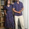 This Navy-Blue Printed couple matching outfit includes a women?s flowy cotton midi dress and a men?s short-sleeve printed shirt. Designed with cheerful floral prints, this set is perfect for summer outings, casual gatherings, or twinning on vacations.